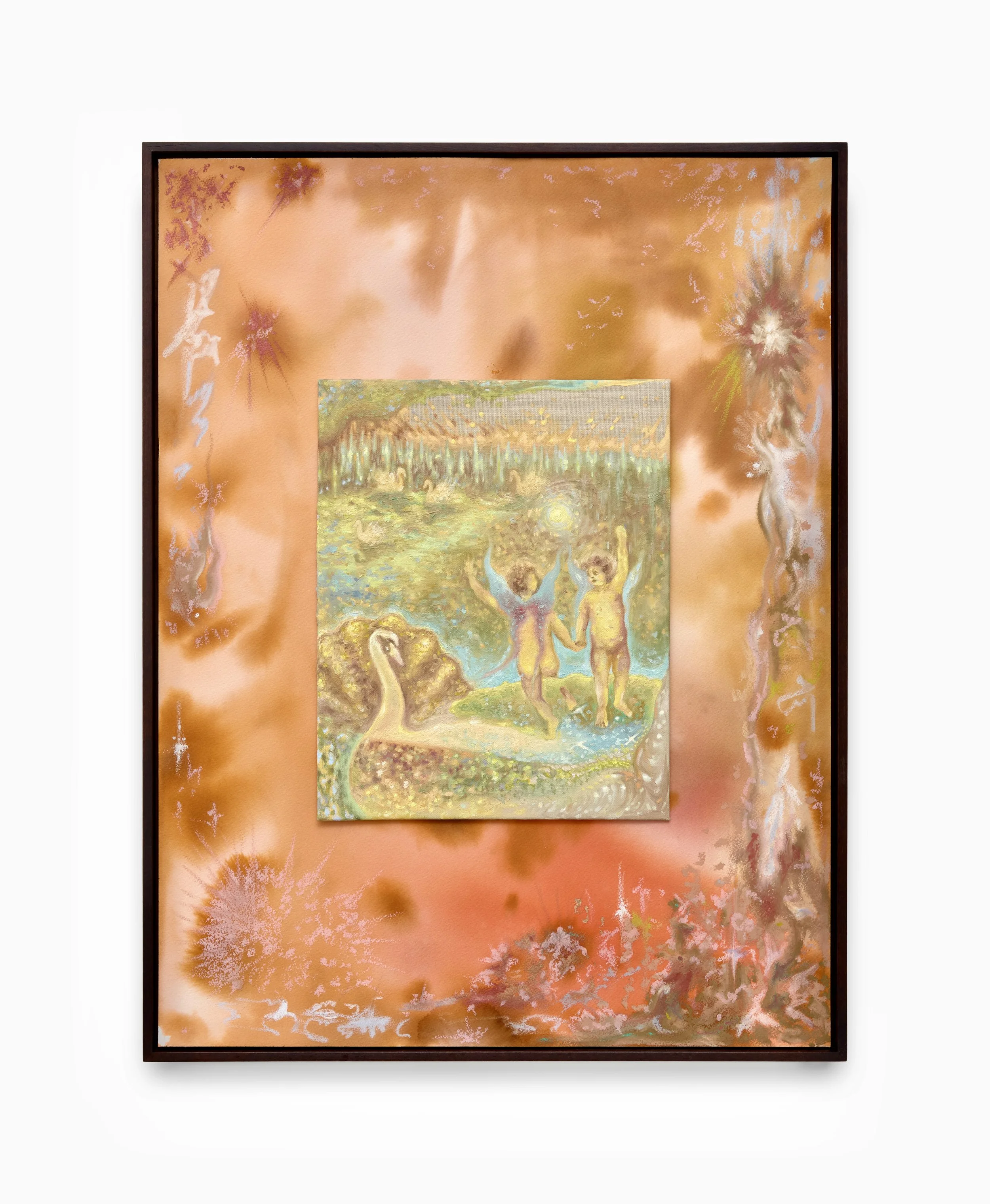 ‘With her new and shimmering works in post-paradise, fuchsia entices us into chimeric dreamscapes, full of cherubim angels, alluring marine creatures and flourishing plant life. Brimming with symbols of purity and refinement, she has developed a unique visual vocabulary to explore ideas of regeneration and growth, on the extreme other side of the current climate crisis. The orchid, representing beauty and love, is a key and recurring symbol in fuchsia’s latest paintings, one that is also redolent of her childhood in Hong Kong. With her works, fuchsia aims to encourage viewers to reawaken and reflect on ecological consciousness, opening up a dialogue that she hopes will transcend the viewing space.’ (Roman Road Gallery)